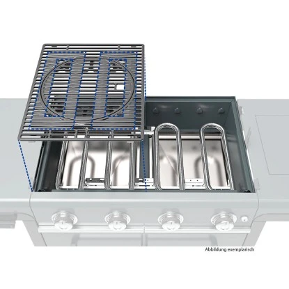 Der Grillrost ist aus Gusseisen und beinhaltet die Culinary Modular Basis. Hierzu können weitere Kocheinsätze erworben werden – für noch mehr Kreativität und Abwechslung. Hierzu entnehmen Sie einfach den inneren Ring des Grillrostes und setzen Zubehörteile, wie einen Pizzastein oder einen Wok in die Basis.